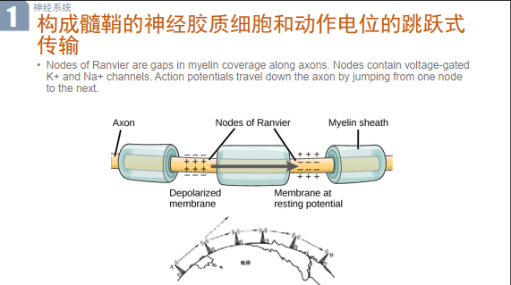 上述过程沿轴突不断重复,动作电位依次在相邻的兰氏结间跳跃传递,直至轴突终扣。