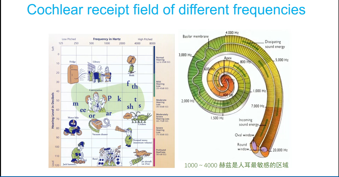 右侧耳蜗图:展示了不同频率的声音会刺激耳蜗(基底膜)的不同区域,比如低频(200Hz)刺激耳蜗顶端(Apex),高频(20000Hz)刺激靠近卵圆窗的区域;同时标注了 “1000~4000 赫兹是人耳最敏感的区域”。