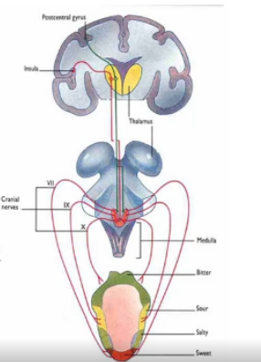 这张图展示了味觉的神经传导通路:味蕾接收味觉刺激后,通过面神经(Ⅶ)、舌咽神经(Ⅸ)、迷走神经(Ⅹ)将信号传递至延髓,再经丘脑中继,最终投射到中央后回、岛叶等大脑皮层区域,产生味觉感知;同时标注了苦、酸、咸等味觉在传导通路中的关联区域,是同等学力心理学国考中味觉生理机制的重要考点。
