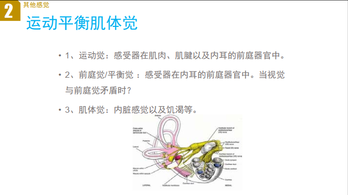 2. 前庭觉(平衡觉):感受器位于内耳前庭器官,提出视觉与前庭觉矛盾的问题;