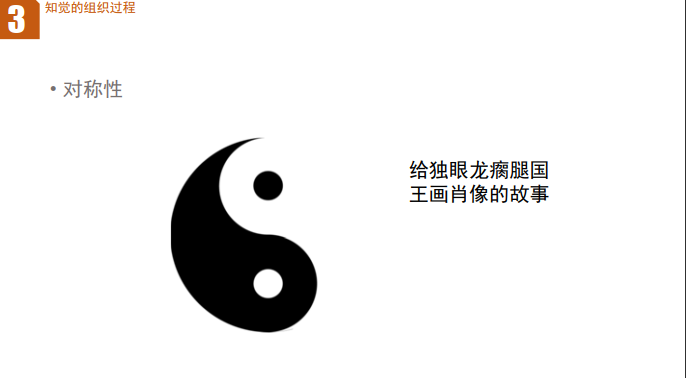 图片中的太极图:太极图的黑白两部分呈现中心对称 + 轴对称的结构,轮廓、面积、形态相互对应且均衡。依据对称性原则,我们不会将其看作孤立的黑、白图形碎片,而是直接知觉为一个完整的太极符号整体。旁边 “给独眼龙瘸腿国王画肖像的故事”,本质也是利用对称性的知觉特点,通过构图的对称平衡,让观者忽略国王的身体缺陷,感知到整体的和谐肖像。