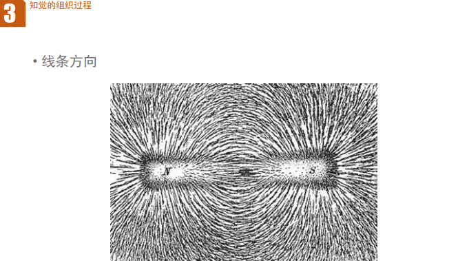 第一张图片(磁场线条图):画面中的线条呈现放射状的方向规律,以两个中心为原点向四周发散,且两侧线条的走向相互呼应。我们的大脑会依据线条的放射方向,将其知觉为两个完整的放射状视觉整体,而非杂乱无章的线条碎片,这是线条方向原则让我们感知到磁场线条的整体排布规律。