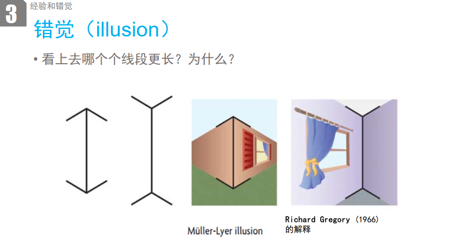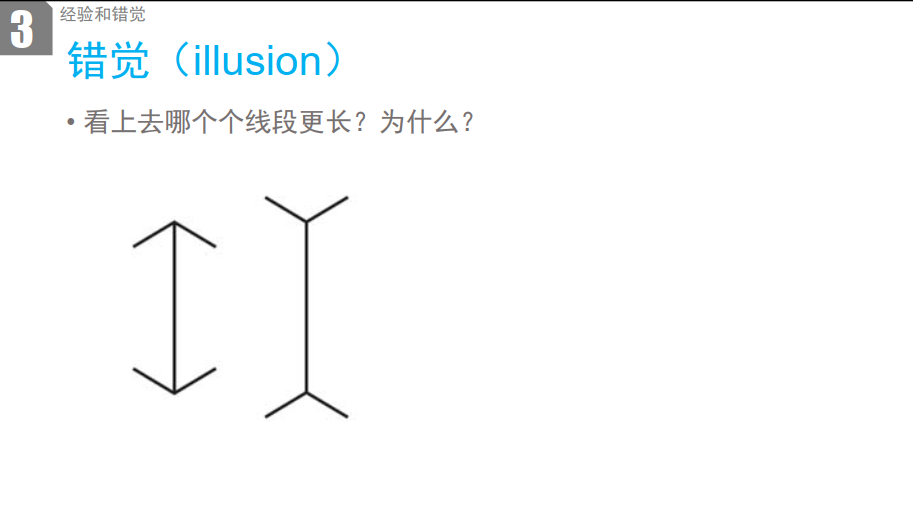 - 原理:这是经典的几何图形错觉,Richard Gregory(1966)的解释认为,人脑会将箭头样式与生活中的空间线索关联(如箭尾像房间的内角、箭尖像房间的外角),通过经验判断 “内角” 对应的线段距离更远,从而感知为更长。
